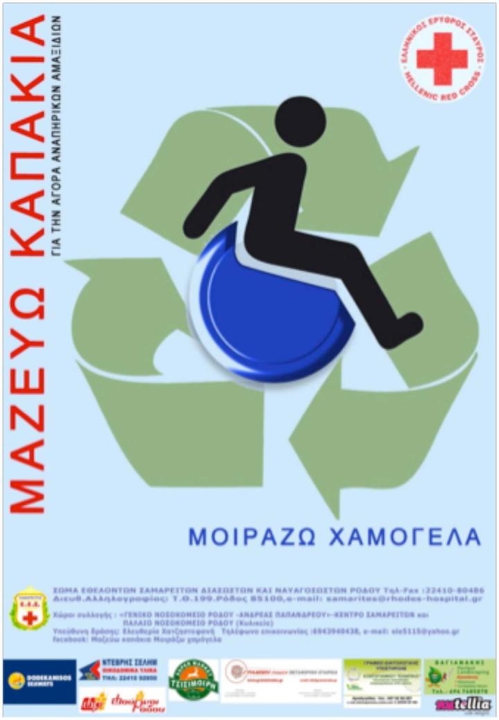 To Τμήμα Εθελοντών Σαμαρειτών Διασωστών και Ναυαγοσωστών Ρόδου ενημερώνει ότι, στα πλαίσια της δράσης «Μαζεύω καπάκια Μοιράζω χαμόγελα», στις 12/2/2015 έγινε αποστολή 4,5 τόνων καπάκια σε εργοστάσιο ανακύκλωσης.Στη σχετική ανακοίνωση αναφέρονται τα εξής:
