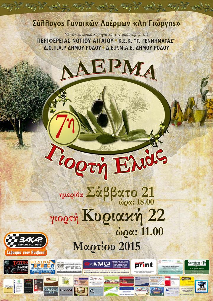 Στα πλαίσια της γιορτής, οι επισκέπτες μπορούν να βρουν παραδοσιακά προϊόντα Λαέρμων, να δοκιμάσουν τοπικά εδέσματα από τις γυναίκες του χωριού και υπέροχες συνταγές με ελιές από τη σχολή Μαγείρων Ρόδου και φυσικά να συμμετέχουν στις εορταστικές καλλιτεχνικές εκδηλώσεις!