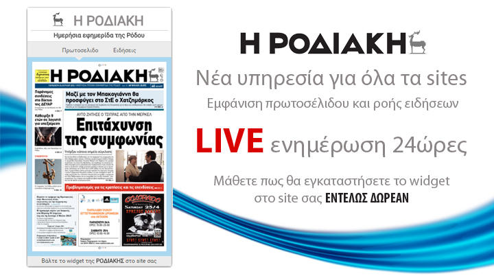 Η ΡΟΔΙΑΚΗ στο πλαίσιο της αναβάθμισης των υπηρεσιών της κατασκεύασε ενα διαδραστικό banner ( widget) δίνοντας έτσι την δυνατότητα σε sites και blogs να εμφανίζουν το πρωτοσέλιδο της εφημερίδας καθώς και τις τελευταίες ειδήσεις ΕΝΤΕΛΩΣ ΔΩΡΕΑΝ.Το μόνο που χρειάζεται είναι να αντιγράψετε τον κώδικα και να τον επικολλήσετε στο μέρος του site/ blog σας που θέλετε να εμφανίζετε το widget.