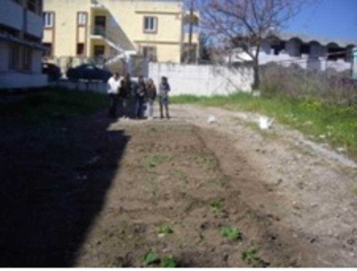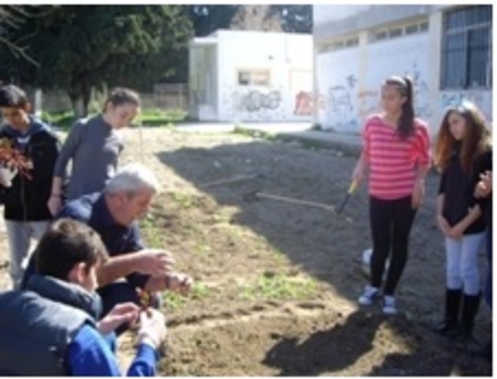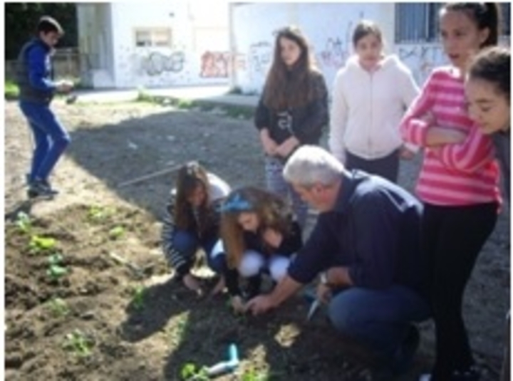 Η περιβαλλοντική ομάδα του προγράμματος «Βιολογικά προϊόντα …..Φροντίζουμε για την υγεία και το περιβάλλον» δημιουργεί ένα βιολογικό λαχανόκηπο, δενδροφυτεύει εσπεριδοειδή και καλλωπίζει ένα παρτέρι στην αυλή του σχολείου της.