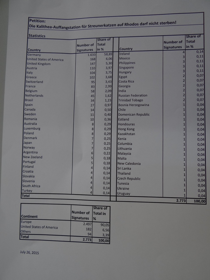 Στην επιστολή επισυνάπτονται οι ηλεκτρονικές υπογραφές από Ευρώπη και Αμερική για το θέμα αυτό, ενώ γίνεται αναφορά σε προειδοποίηση των εθελοντών κτηνιάτρων ότι δηλαδή θα απέχουν από την εθελοντική τους προσφορά αν δεν βελτιωθεί ουσιαστικά η κατάσταση.