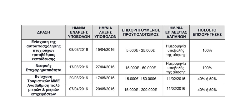 Την Πέμπτη 11-02-2016 ανακοινώθηκαν τέσσερα νέα προγράμματα συνολικού προϋπολογισμού 350 εκατ. Ευρώ για όλη τη χώρα, οι δράσεις αφορούν στην ενίσχυση ανέργων και αυτοαπασχολούμενων πτυχιούχων τριτοβάθμιας εκπαίδευσης, τη νεοφυή επιχειρηματικότητα, την αναβάθμιση μικρών και πολύ μικρών επιχειρήσεων για την ανάπτυξη των ικανοτήτων τους στις νέες αγορές καθώς και στην ενίσχυση Τουριστικών Μικρομεσαίων Επιχειρήσεων για την ποιοτική αναβάθμιση των παρεχόμενων υπηρεσιών.