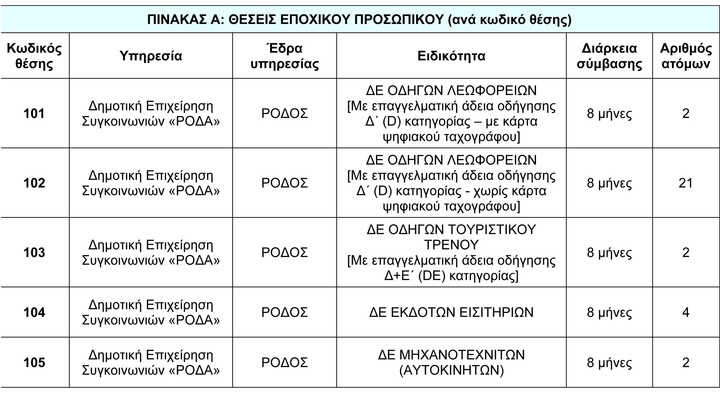 Ανακοίνωση για την πρόσληψη, με σύμβαση εργασίας ιδιωτικού δικαίου ορισμένου χρόνου, συνολικά τριάντα ενός (31) ατόμων για την κάλυψη εποχικών ή παροδικών αναγκών της Δημοτικής Επιχείρησης Συγκοινωνιών «ΡΟΔΑ».