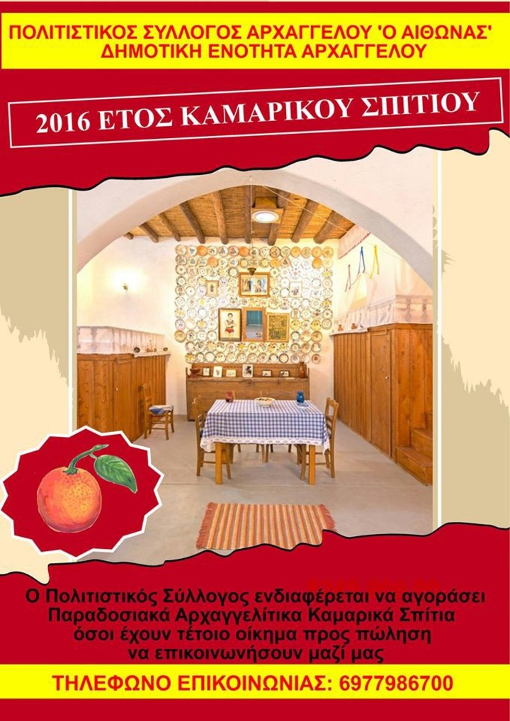 Παραδοσιακά Αρχαγγελίτικα σπίτια με καμάρα, ενδιαφέρεται να αγοράσει ο πολιτιστικός σύλλογος Αρχαγγέλου «Ο Αίθωνας» προκειμένου να τα αξιοποιήσει και να τα αναδείξει.