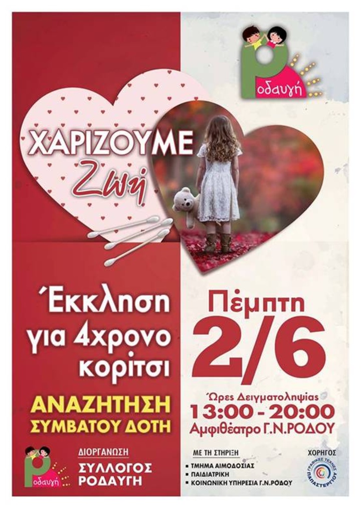 Ο Δωδεκανησιακός Σύλλογος «Ροδαυγή» κάνει έκκληση για τετράχρονο κορίτσι που χρήζει μεταμόσχευσης μυελού των οστών.