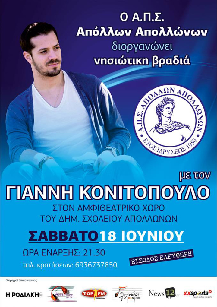 Τη μοναδική ευκαιρία να διασκεδάσουν και παράλληλα να ενισχύσουν οικονομικώς την ομάδα τους θα έχουν οι φίλαθλοι του Απόλλωνα Απολλώνων. Το ερχόμενο Σάββατο στις 21.30 θα γίνει στον αμφιθεατρικό χώρο του δημοτικού σχολείου Απολλώνων η μουσική νησιώτικη βραδιά με προσκεκλημένο το Γιάννη Κονιτόπουλο.