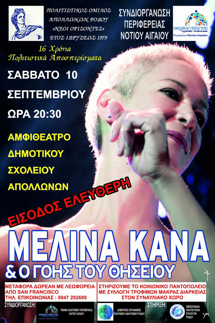 Κορυφαία στιγμή των φετινών εκδηλώσεων η μεγάλη συναυλία της Μελίνας Κανά στο αμφιθέατρο του Δημοτικού Σχολείου Απολλώνων, το Σάββατο 10 Σεπτεμβρίου στις 8:30μμ.