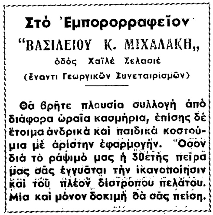 «Επανερχόμενοι επί αθρόας εισαγωγής ιταλικών ζυμαρικών παρακαλούμεν επισπευθή επιβολή ειδικής φορολογίας προς προστασίαν εντοπίου παραγωγής. Ηδη ενταύθα βιομήχανοι ζυμαρικών εκοινοποίησαν αθρόας απολύσεις εργαζομένων. Υφισταμένη ανεργία δεν Ρόδω δεν επιτρέπει δημουργίαν νέων ανέργων με συνέπειαν κοινωνικήν αναταραχήν.