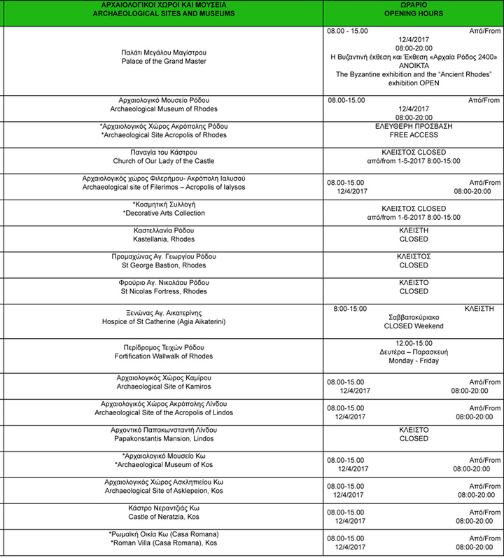 Σε ό,τι αφορά την περιοχή μας, τα μουσεία και οι αρχαιολογικοί χώροι που θα λειτουργήσουν με διευρυμένο ωράριο είναι συνολικά εννιά. Πρόκειται για το παλάτι των ιπποτών, το αρχαιολογικό μουσείο Ρόδου, την Aκρόπολη Φιλερήμου, την Aκρόπολη Λίνδου και τον αρχαιολογικό χώρο της Καμείρου που βρίσκονται στο νησί της Ρόδου και το αρχαιολογικό μουσείο Κω, το Ασκληπιείο, το κάστρο Νεραντζιάς και τη Ρωμαϊκή Οικία Κω στο νησί της Κω.