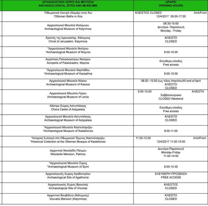 Σημειώνεται ότι το οθωμανικό λουτρό Κω θα λειτουργεί μέχρι τις 5 το απόγευμα, ενώ σε κάποιες περιπτώσεις τα αξιοθέατα θα ανοίξουν τις πύλες τους το Μάιο, ή τον Ιούνιο και σε κάποιες άλλες θα λειτουργούν μόνο μέχρι το μεσημέρι.