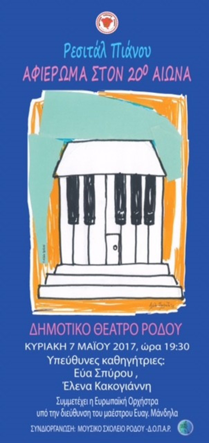 Το Μουσικό Σχολείο Ρόδου σε συνδιοργάνωση με τον Δημοτικό Οργανισμό Πολιτισμού – Αθλητισμού Ρόδου (Δ.Ο.Π.Α.Ρ.) έχουν την τιμή και τη χαρά να σας προσκαλέσουν σε ρεσιτάλ πιάνου αφιερωμένο στον 20ο αιώνα, που θα πραγματοποιηθεί την Κυριακή 7 Μαΐου και ώρα 7.30 μ.μ στο Δημοτικό Θέατρο Ρόδου.