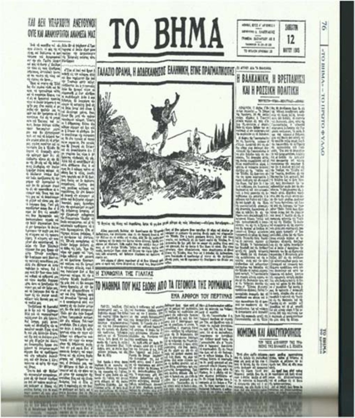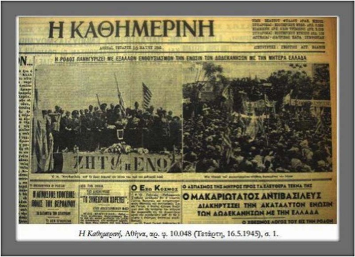 Από σήμερα οι χάρτες σημειώνουν με τα άγια ελληνικά χρώματα τα νησιά που, πάντα ελληνικά εις τη ψυχή τους,εσημειώνοντο όμως με ξένα χρώματα ξένων πατρίδων. Οι αύρες του Αιγαίου μεταφέρουν τα μηνύματα της μεγάλης εθνικής χαράς, που πλημμυρίζει την Ελλάδα. Είναι η πρώτη χαρούμενη δόνησις, ύστερα από τόσες πικρίες, που υπενθυμίζει εις την ηρωική καρδιά της Ελλάδος, ότι η Δικαιοσύνη, δεν έχει χαθεί από τον κόσμον της μεγάλης Νίκης κατά του φασισμού, δια την οποίαν η ίδια έδωσε τα πάντα. Είναι τόσον αυτονόητα, τόσον αδιαφιλονίκητα, τόσον απαράγραπτα τα εθνικά δίκαια της Ελλάδος, όπως ήταν και η επάναδος της Δωδεκανήσου, ώστε δικαιούμεθα να προσδωκούμε με πίστιν εις νέα αγγέλματα εθνικής χαράς, που θα σημειώσουν την ολοκλήρωσιν των εθνικών μας πόθων».