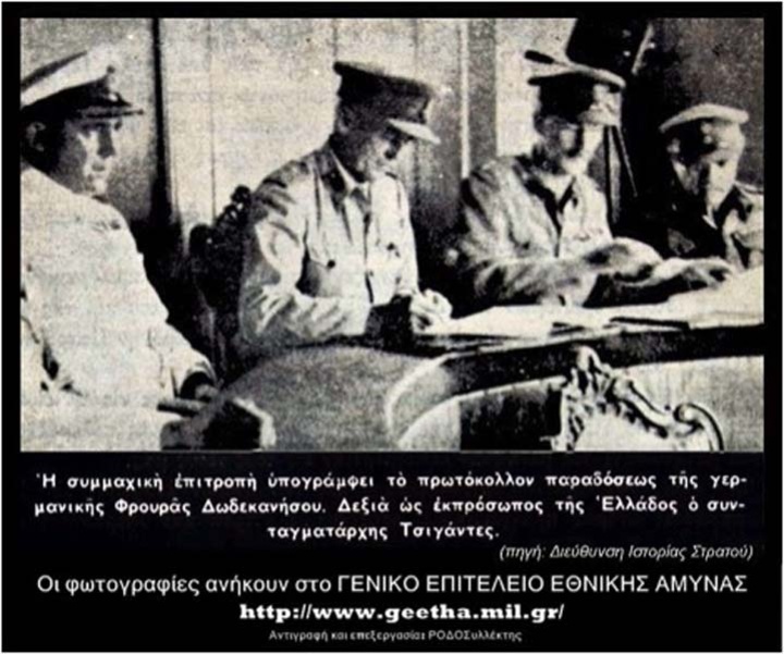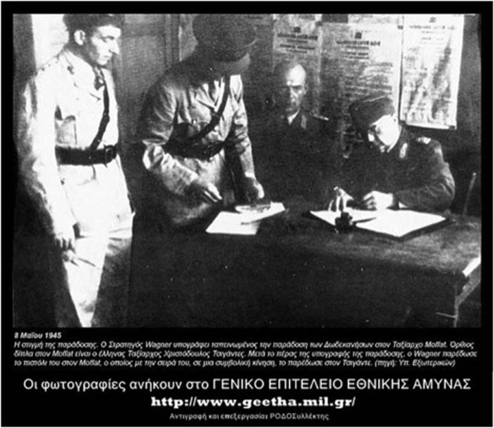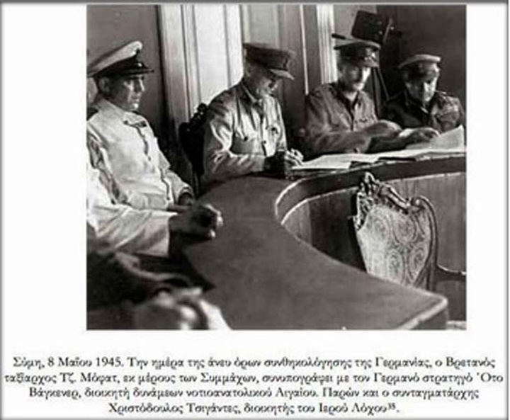 8 Μαΐου 1945 – Σύμη: Επέτειος της υπογραφής του Πρωτόκολλου παράδοσης της Δωδεκανήσου στους συμμάχους, από τον αρχηγό των γερμανικών Δυνάμεων κατοχής, στρατηγό Wagener, στο Άγγλο Αρχιστράτηγο των Δυνάμεων της Μέσης Ανατολης, Page , στους Άγγλους, ταξίαρχο Moffat καί ναύαρχο Tennant και στον Ιερό Λόχο του συνταγματάρχη Χριστόδουλου Τσιγάντε.