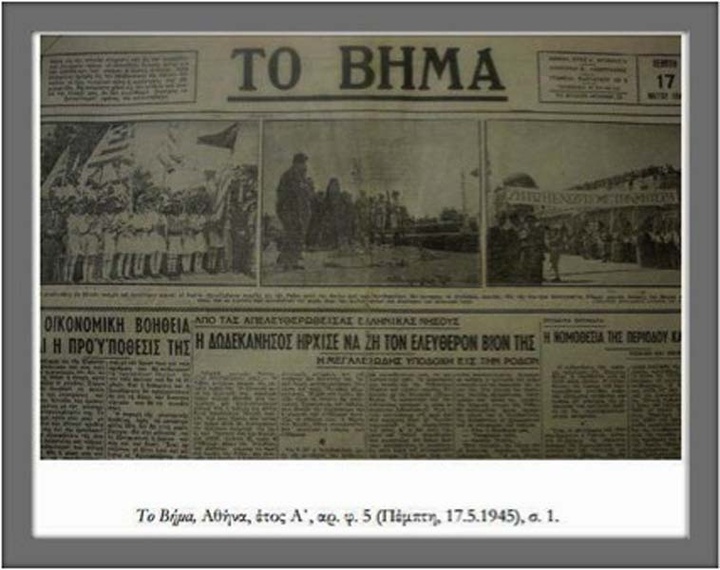 Με αφορμή την επέτειο συμπλήρωσης 72 χρόνων από την υπογραφή του Πρωτοκόλλου παράδοσης στη Σύμη και ανατρέχοντας το ιστορικό αρχείο, η εφημερίδα «Το Βήμα» στο πρωτοσέλιδο της, με τίτλο «ΓΑΛΑΖΙΟ ΟΡΑΜΑ,Η ΔΩΔΕΚΑΝΗΣΟΣ ΕΛΛΗΝΙΚΗ, ΕΓΙΝΕ ΠΡΑΓΜΑΤΙΚΟΤΗΣ», στις 12 Μαΐου 1945, αναφέρει για το σπουδαίο αυτό ιστορικό γεγονός, για τη Δωδεκάνησο: