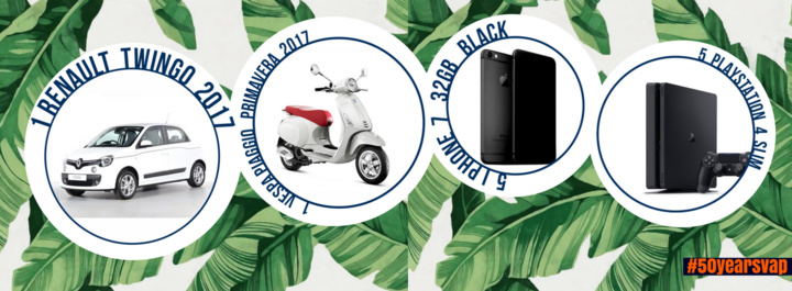 1 Renault Twingo, 1 Vespa primavera, 5 iPhone 7 32GB, 5 Playstation 4 Slim και περισσότεροι από 15.000 τυχεροί, θα κερδίσουν διάφορα επετειακά δώρα όπως: Powerbanks, Πετσέτες θαλάσσης, Ισοθερμικά backpacks, Ηλιοπροστασίες αυτοκινήτου, Οικολογικές Shopping bags και Τράπουλες.