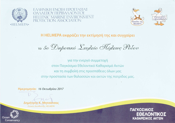 Έτσι, λοιπόν, οι μαθητές/τριες της Α1, Γ1, Γ2, Δ1, Δ2 και ΤΕ του 5ου ΔΣ Πόλεως Ρόδου με αφορμή την Εβδομάδα Περιβαλλοντικής Εκπαίδευσης και τη συμμετοχή τους στα προγράμματα «Νοιάζομαι, Δρω και Κινητοποιώ» και «Παιδική HELMEPA» ανέλαβαν στις 16/10/2017 δράση καθαρισμού στην Παραλία της Ακτής Κανάρη, στην πόλη της Ρόδου. Μια δράση ευαισθητοποίησης και ενεργού συμμετοχής των μαθητών/τριών ως σημερινοί εκπαιδευόμενοι μαθητές, αυριανοί ενεργοί πολίτες.