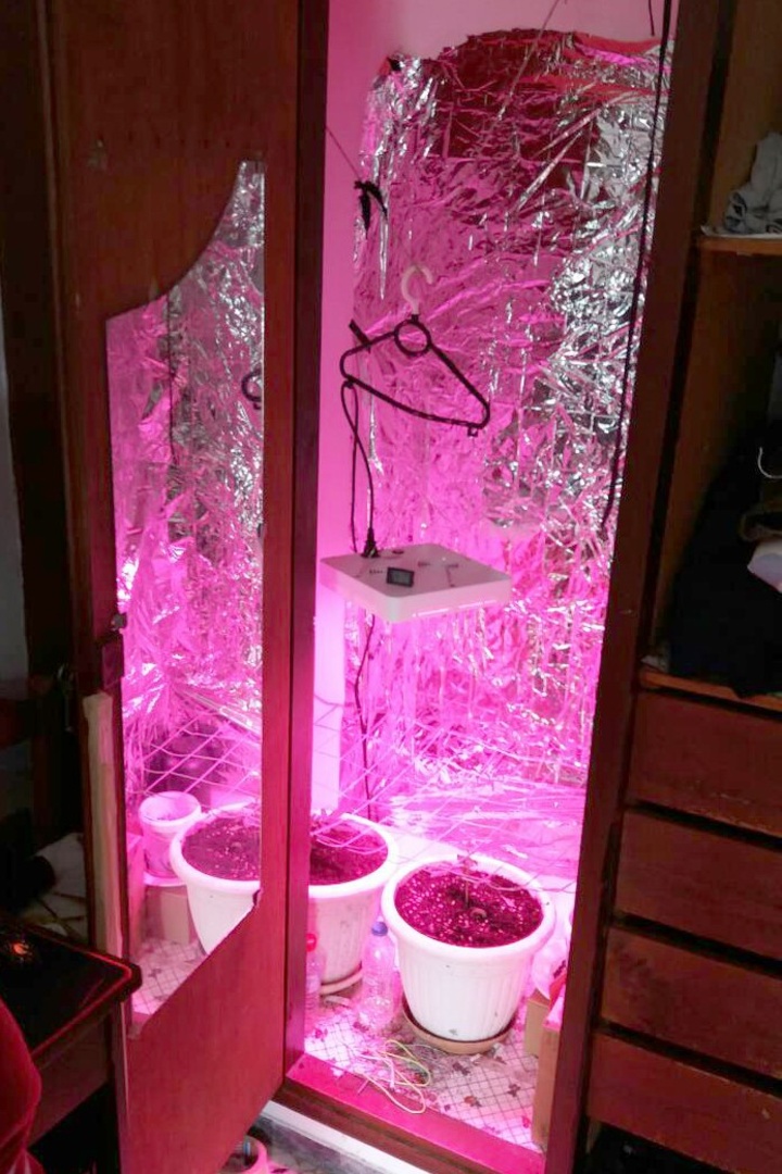 Στην κατοικία του 24χρονου εντοπίσθηκε παραγωγή ελεγχόμενης καλλιέργειας κάνναβης σε ειδικά διαμορφωμένο χώρο (ντουλάπα) με χρήση τεχνιτών και χημικών μέσων που εξασφαλίζουν κατάλληλες περιβαλλοντικές συνθήκες ανάπτυξης.