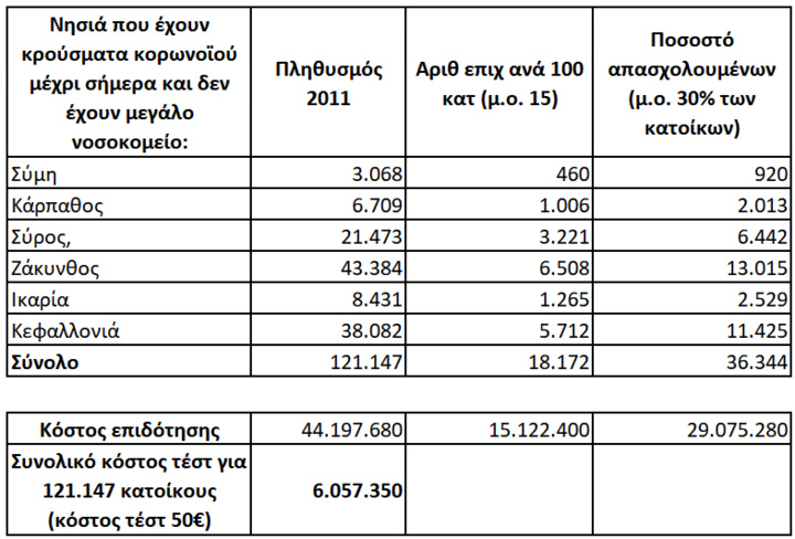 Είναι προτιμότερο για τη χώρα μας να πραγματοποιηθούν τεστ στις νησιωτικές περιοχές, πριν εξαπλωθεί η νόσος μαζικά, παρά να κληθεί όλο το σύστημα υγείας να αντιμετωπίσει ένα τεράστιο νούμερο πασχόντων εκ των υστέρων. Οι λήψεις μπορούν να γίνουν από το υγειονομικό δυναμικό των υπάρχοντων κέντρων υγείας, από το πρόγραμμα «Βοήθεια στο Σπίτι», καθώς και από τοπικά ιατρεία και νοσοκομεία. Αντιλαμβανόμαστε ότι είναι εξαιρετικά περιορισμένο το ανθρώπινο δυναμικό, αλλά μπορούν να αναπτυχθούν ειδικά κλιμάκια για τα νησιά, αφού ούτως ή άλλως η λύση αυτή είναι η πλέον συμφέρουσα για το ελληνικό κράτος.