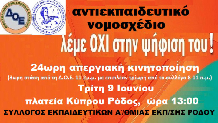 Απεργούν την ερχόμενη Τρίτη 9 Ιουνίου τα μέλη του συλλόγου Εκπαιδευτικών Α/θμιας Εκπαίδευσης Ρόδου, σε ένδειξη διαμαρτυρίας για το πολυνομοσχέδιο που αφορά τις αλλαγές στο χώρο της παιδείας και το οποίο ψηφίζεται την επόμενη ημέρα στη Βουλή.