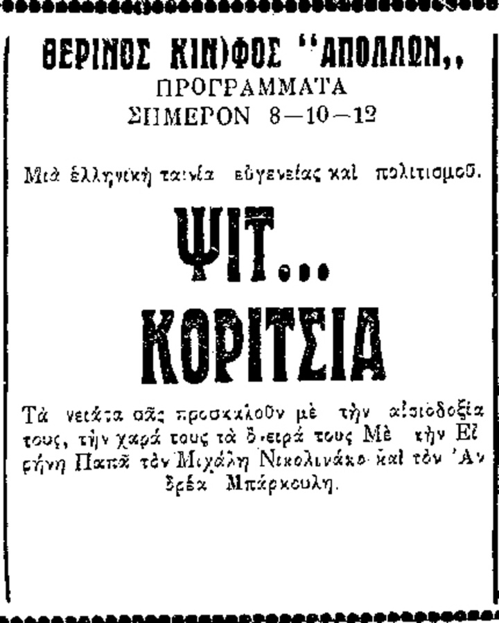 Αύριον αφικνούνται εις Ρόδον ο σκηνοθέτης κ. Ορέστης Λάσιος και ο Διευθυντής φωτογραφίας κ. Ανδρέας Αναστασάκος προκειμένου να καθωρίσουν τα «εξωτερικά» όπου από της προσεχούς εβδομάδος θα αρχίση εντατικά να γυρίζεται η νέα ταινία της «Ελ-Τουρέ» «Διακοπές στο Μιραμάρε». Εις την αισθηματική αυτή κομεντί, που είναι ένα μοντέρνο παραμύθι, θα κάνει την κινηματογραφικήν επανεμφάνισίν της η Σμαρούλα Γιούλη και θα πρωταγωνιστήσουν επίσης πολλοί νέοι ηθοποιοί οι οποίοι πρωτοεμφανίζονται εις την εν λόγω ταινίαν. Την μουσική και τα τραγούδια της εν λόγω ταινίας έγραψε ο Μίμης Πλέσσας. Επίσης αναμένονται οι ηθοποιοί δια την ταινίαν «Απολύτρωση».