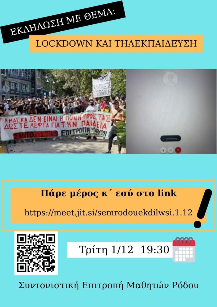 Με αφορμή αυτήν την κατάσταση πήραμε την απόφαση σαν Συντονιστική Επιτροπή μαθητών Ρόδου να προχωρήσουμε σε διαδικτυακή σύσκεψη με θέμα LOCKDOWN KAI ΤΗΛΕΚΠΑΙΔΕΥΣΗ, στην οποία καλούμε να συμμετέχουν και οι συμμαθητές μας από την Σάμο μαζί με την συντονιστική τους επιτροπή, που έδωσαν και εκείνοι την ίδια μάχη στο νησί τους όπως και εμείς, επιδιώκουμε με αυτόν τον τρόπο να γίνει πλούσια συζήτηση και να ανταλλάξουμε πείρα και να οργανώσουμε τους αυριανούς αγώνες μας.