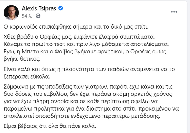 Εν τέλει μόνο ο μικρός Ορφέας έδιαγνώστηκε με κορωνοϊό, ενώ ο Αλέξη Τσίπρας, η Μπέττυ Μπαζιάνα και ο έτερος γιος τους, Φοίβος, βρέθηκαν αρνητικοί.