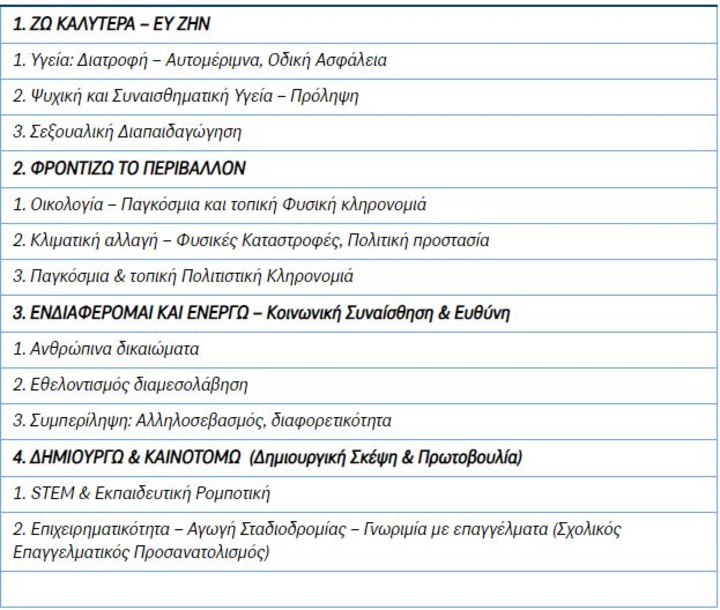 Τα Εργαστήρια Δεξιοτήτων περιλαμβάνουν τέσσερις θεματικούς κύκλους, με υπο-θεματικές σταθμισμένες ανά ηλικία και εκπαιδευτική βαθμίδα:
