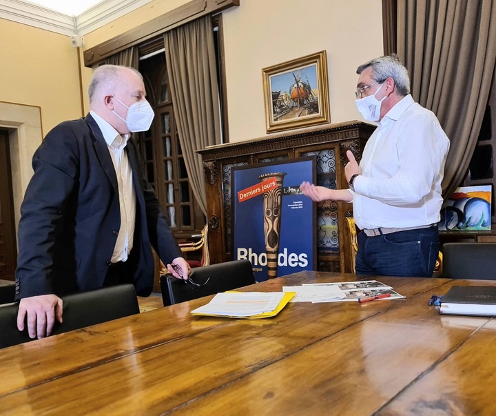 Συνάντηση εργασίας είχαν χθες το βράδυ στην Περιφέρεια ο Περιφερειάρχης Νοτίου Αιγαίου, Γιώργος Χατζημάρκος και ο Δήμαρχος Ρόδου, Αντώνης Καμπουράκης, προκειμένου να δρομολογηθεί η υλοποίηση της πρότασής τους για την σύσταση και λειτουργία στη Ρόδο ενός μεγα-εμβολιαστικού κέντρου, η οποία έγινε αποδεκτή από την κυβέρνηση, όπως ανακοίνωσε, κατά την επίσκεψή του στο Νοσοκομείο της Ρόδου ο Διοικητής της 2ης Υγειονομικής Περιφέρειας Πειραιώς και Αιγαίου, Χρήστος Ροϊλός.