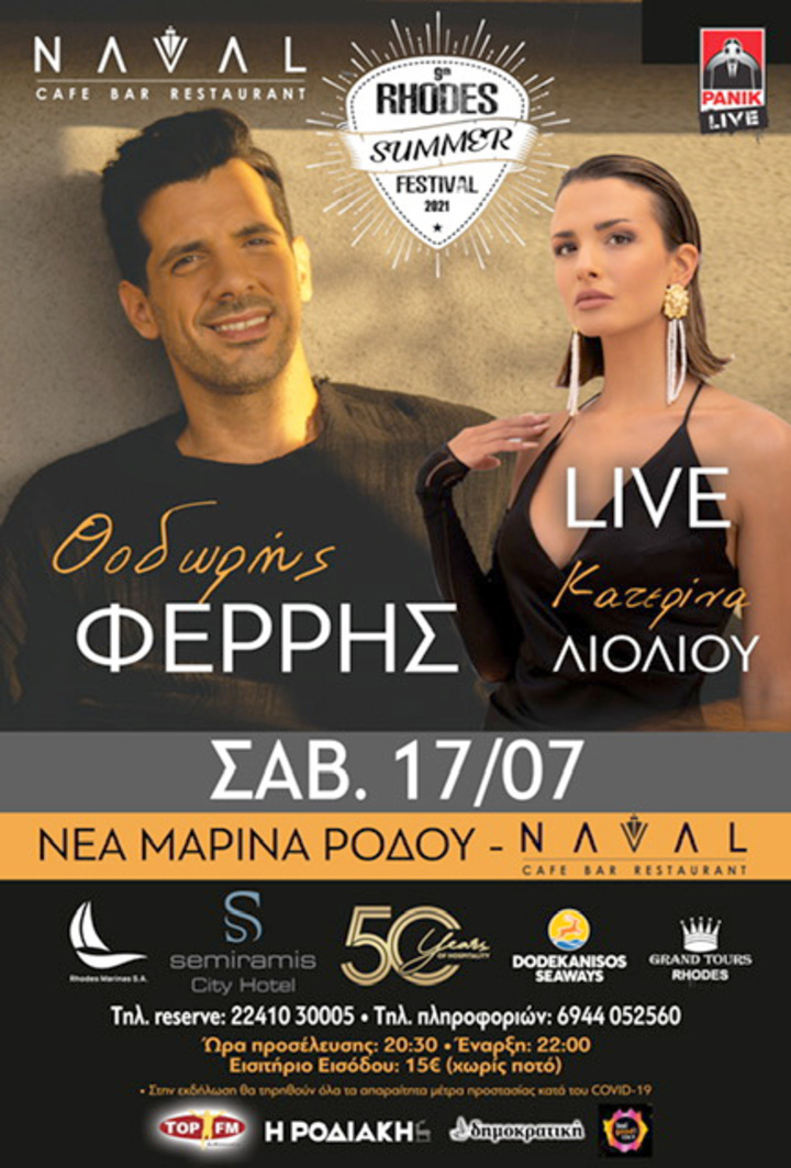 Το πρώτο live του καλοκαιριού δίπλα στη θάλασσα είναι γεγονός! Ο Θοδωρής Φέρρης και η Κατερίνα Λιόλιου έρχονται στη Νέα Μαρίνα Ρόδου και συγκεκριμένα στο NAVAL, για να μας απογειώσουν με τις μελωδίες τους.