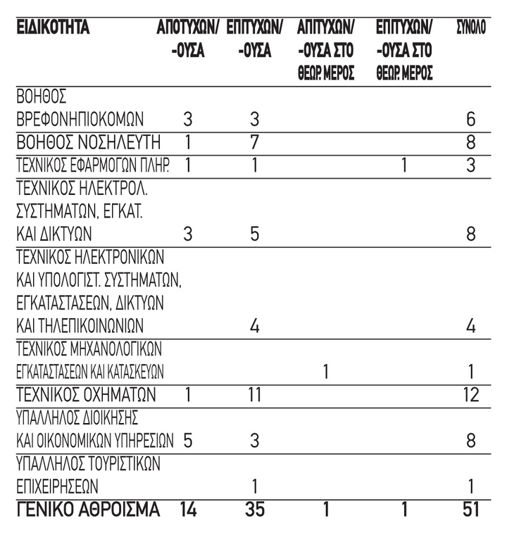 Ακολουθεί πίνακας με τα αποτελέσματα ανά Ειδικότητα.