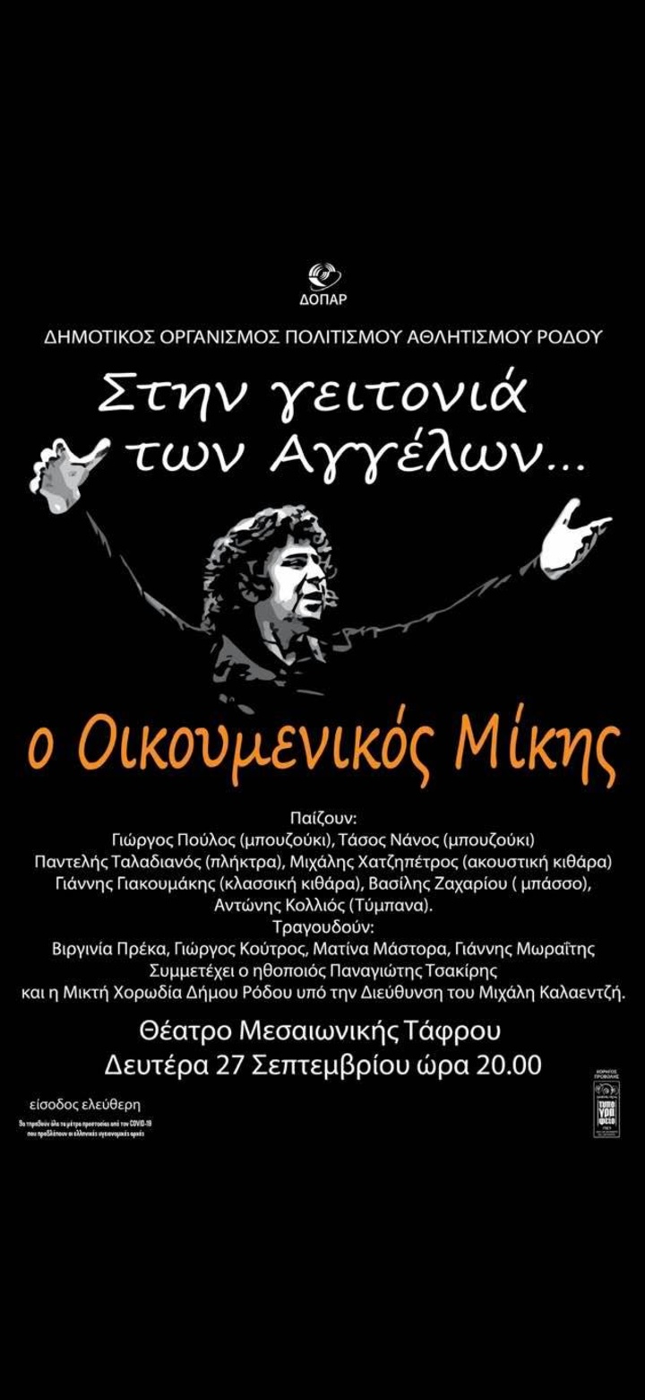 Η εκδήλωση έχει τίτλο «Στη γειτονιά των αγγέλων…ο Οικουμενικός Μίκης» και παίζουν: Γιώργος Πούλος (μπουζούκι), Τάσος Νάνος (μπουζούκι), Παντελής Ταλαδιανός (πλήκτρα), Μιχάλης Χατζηπέτρος (ακουστική κιθάρα), Γιιάννης Γιακουμάκης (κλασική κιθάρα), Βασίλης Ζαχαρίου (μπάσσο), Αντώνης Κολλιός (τύμπανα).