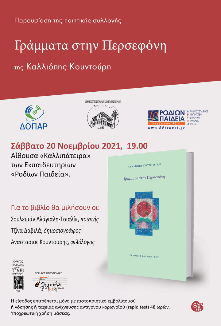 Η βιβλιοπαρουσίαση θα πραγματοποιηθεί το Σάββατο 20 Νοεμβρίου 2021 και ώρα 19.00 στην αίθουσα εκδηλώσεων «Καλλιπάτειρα» των Εκπαιδευτηρίων «Ροδίων Παιδεία».