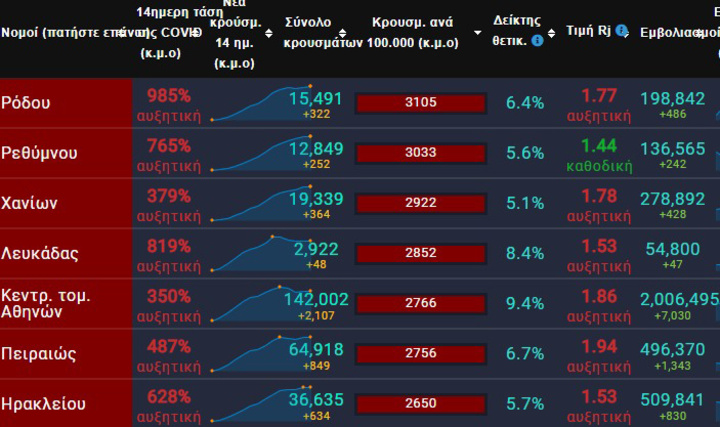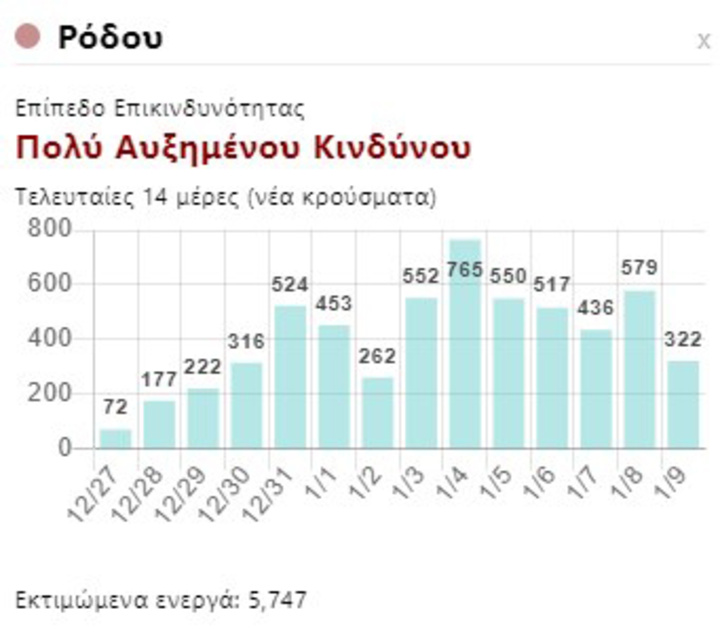 Από τα ίδια στοιχεία πάντως, φαίνεται ότι στην Περιφερειακή Ενότητα της Ρόδου, το σύνολο των κρουσμάτων των τελευταίο 15ήμερο, είναι στην πρώτη θέση ανάμεσα σε όλες τις περιοχές της χώρας, με δεδομένο των αριθμό των κατοίκων που έχουμε και τα δηλωμένα κρούσματα αντίστοιχα.