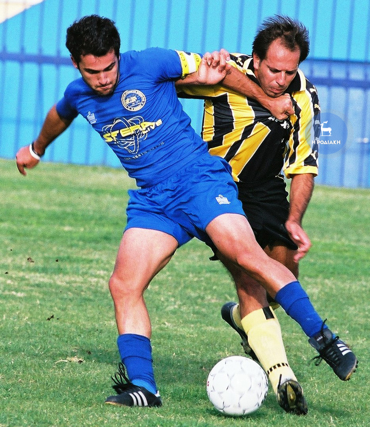 Αριστερά ο Νίκος Ορφανίδης από τους φιλοξενούμενους με τον Αργύρη Σκυλλαράκη, τον παίκτη που πέτυχε αρκετά γκολ εκείνη την περίοδο με τους «κιτρινόμαυρους».