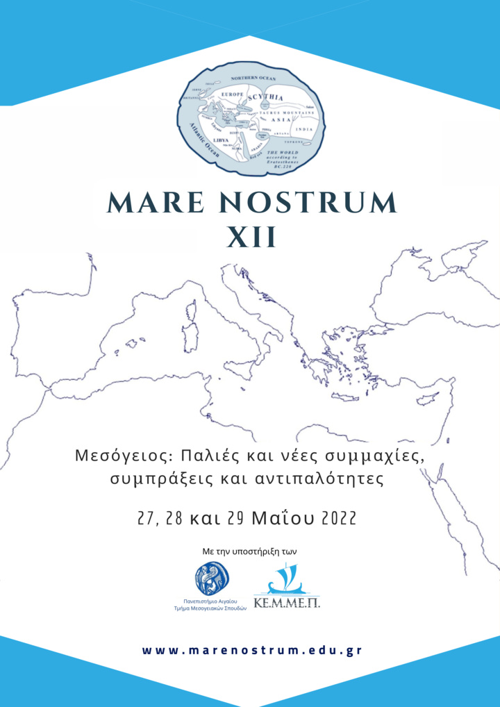 Πρόσκληση εκδήλωσης ενδιαφέροντος για συμμετοχή στο φοιτητικό συνέδριο MARE NOSTRUM XIΙ με θέμα: «Μεσόγειος: παλιές και νέες συμμαχίες, συμπράξεις και αντιπαλότητες» διοργανώνεται από το Τμήμα Μεσογειακών Σπουδών, του Πανεπιστημίου Αιγαίου, με την υποστήριξη του Κέντρου Μελέτης Μεσογειακής – μεσανατολικής πολιτικής και πολιτισμού (ΚΕΜΜΕΠ).