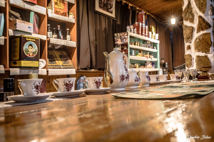 Ετσι, στο Καφέ μπορεί κανείς να θαυμάσει αντικείμενα αντίκες και κειμήλια, ενώ στον ίδιο χώρο στεγάζονται τρεις θεματικές (Τσαγκάρικο, Κουρείο και Παντοπωλείο), αντίγραφα «μαγαζιών» που λειτουργούσαν παλαιότερα μέσα στα «καλά» Καφέ της Ελλάδας. Στο κυρίως σαλόνι του Καφέ κυριαρχεί το Ιταλικό στοιχείο με αυθεντικά αντικείμενα της δεκαετίας του 1920.