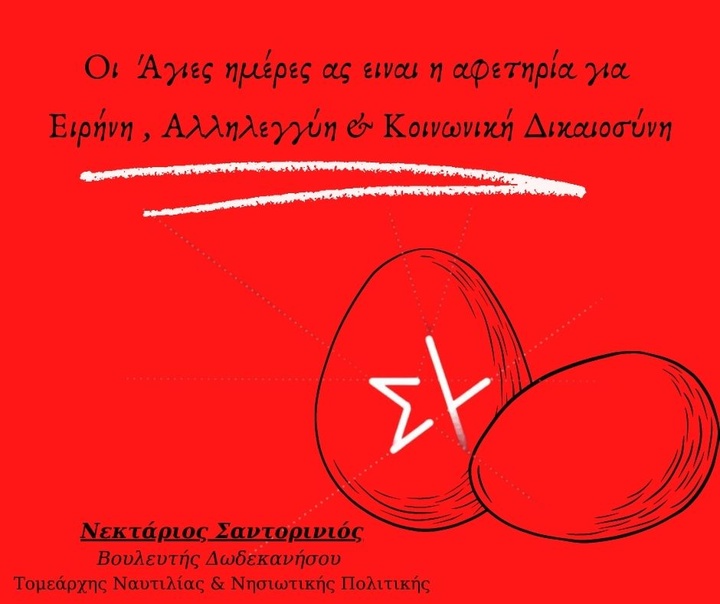 Στους μικρομεσαίους επιχειρηματίες, στους υγειονομικούς, στους ασθενείς και τους αδύναμους. Αυτό το Πάσχα ας σηματοδοτήσει την Ανάσταση, όπως την επιθυμεί ο καθένας και η καθεμιά, τη φωτεινή διέξοδο και την αναγέννηση προς τα όνειρά μας. Ας μπολιάσει την ελπίδα για ένα αύριο προόδου, ενότητας, πολιτικής αλλαγής και δημιουργίας. Πολλές ευχές για υγεία, ειρήνη και δύναμη για μια νέα αρχή!».