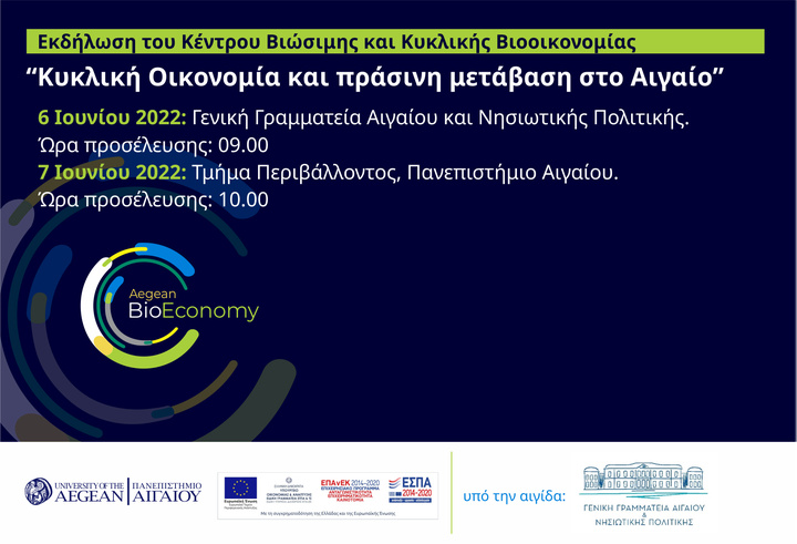 Τη Δευτέρα, 6 Ιουνίου 2022, ώρα 09.00 ξεκινά η εκδήλωση με θέμα: «Κυκλική Οικονομία και πράσινη μετάβαση στο Αιγαίο», στη Γενική Γραμματεία Αιγαίου και Νησιωτικής Πολιτικής, στο πλαίσιο υλοποίησης του έργου «Κέντρο Βιώσιμης και Κυκλικής Βιοικονομίας» (https://bioeconomy.aegean.gr/).