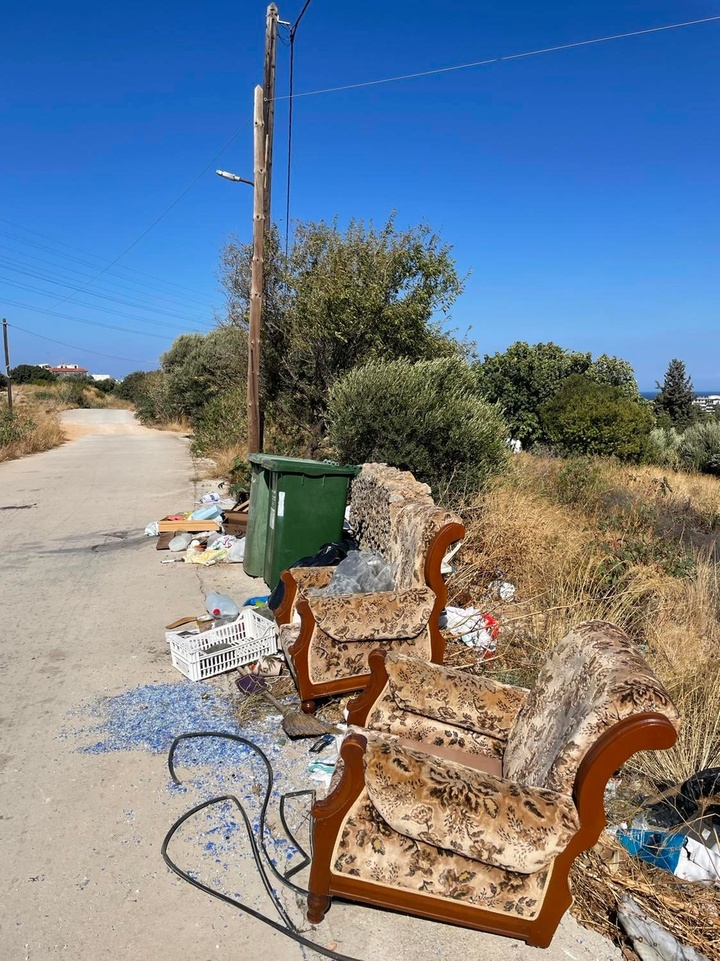 Οι ασυνείδητοι, άφησαν... ένα μικρό νοικοκυριό πεταμένο στον δρόμο, δίπλα από τους κάδους των σκουπιδιών, ενώ σκόρπια στον δρόμο βρίσκονταν ανοιγμένες σακούλες με διάφορα πράγματα αλλά και σκουπίδια.