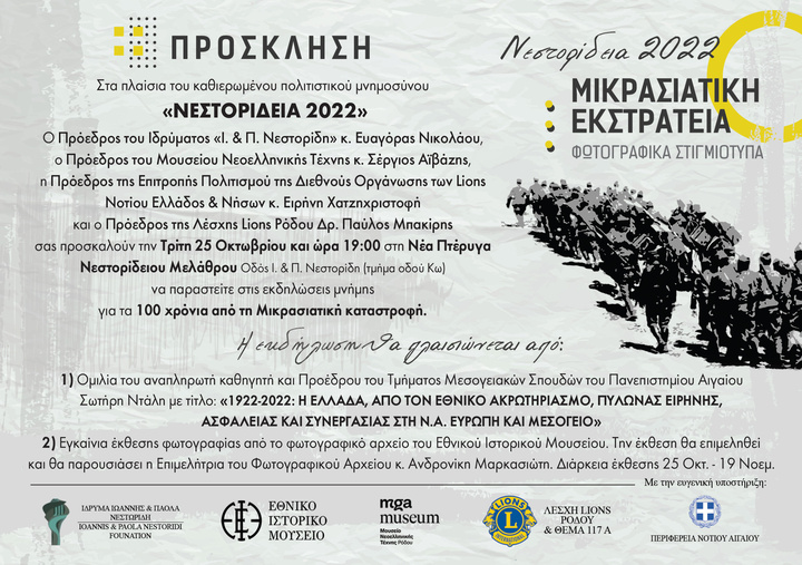 Η Λέσχη Lions Ρόδου μαζί με το Ίδρυμα «Ν. & Π. Νεστορίδη», το Μουσείο Νεοελληνικής Τέχνης Ρόδου, και την Επιτροπή Πολιτισμού της Διεθνούς Οργάνωσης των Lions Νοτίου Ελλάδος & Νήσων, στο πλαίσιο του καθιερωμένου πολιτιστικού μνημόσυνου «ΝΕΣΤΟΡΙΔΕΙΑ 2022», διοργανώνουν εκδηλώσεις μνήμης για τα 100 χρόνια από τη Μικρασιατική Καταστροφή με έκθεση φωτογραφίας από το φωτογραφικό αρχείο του Εθνικού Ιστορικού Μουσείου με διάρκεια έκθεσης 25 Οκτωβρίου 2022 έως 19 Νοεμβρίου 2022.