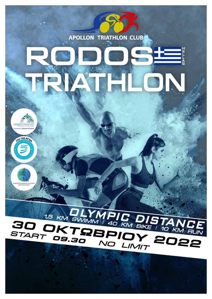 «Σας γνωστοποιούμε ότι παραχωρούμε αιγίδα και έγκριση για τον αγώνα Τριάθλου με την επωνυμία “RHODES TRIATHLON OLYMPIC DISTANCE” που διοργανώνει ο Αθλητικός Σύλλογος της Ρόδου “Apollon Triathlon Club”, σε συνεργασία με την Περιφέρεια Νοτίου Αιγαίου, το Δήμο Ρόδου και το Δημοτικό Οργανισμό Πολιτισμού Αθλητισμού Ρόδου, την Κυριακή 30 Οκτωβρίου 2022, στο κέντρο της πόλης της Ρόδου (πλατεία Κουντουριώτη, παραλιακό μέτωπο Κρητικών, Ψαροπούλας, Νεωρίου) Ο αγώνας θα είναι Ολυμπιακής απόστασης (1.5 χλμ. κολύμπι, 40 χλμ. ποδήλατο, 10 χλμ. τρέξιμο).
