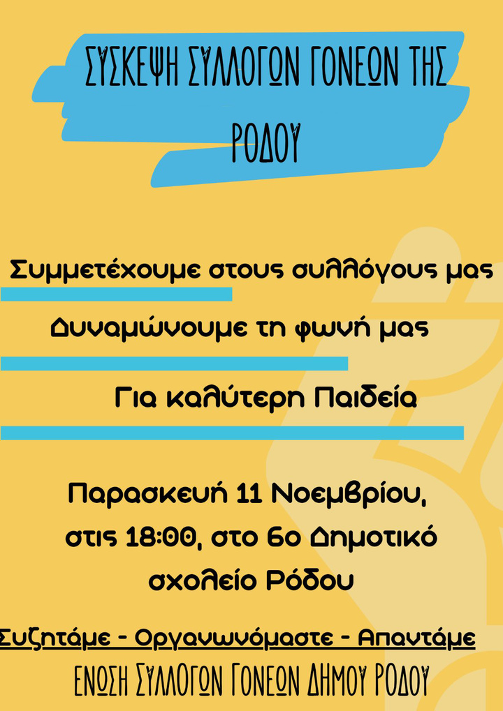 Η Ένωση Συλλόγων Γονέων Ρόδου καλεί τους γονείς–μέλη των Συλλόγων Γονέων σε σύσκεψη την Παρασκευή 11 Νοεμβρίου 2022 στις 6.00μ.μ στο 6ο Δημοτικό σχολείο Ρόδου (απέναντι από τη νέα μαρίνα) για να συζητήσουμε όσα μας προβληματίζουν και να οργανώσουμε τον αγώνα μας για να γίνουν καλύτερα τα σχολεία μας.