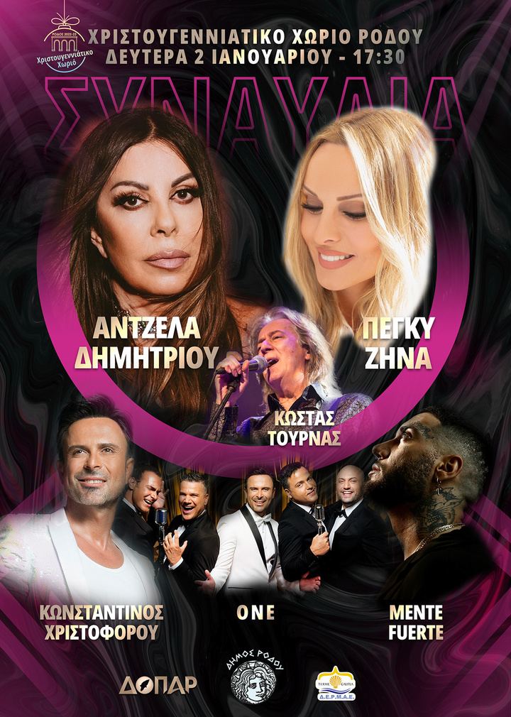 Στις 2 Ιανουαρίου 2023, στο Χριστουγεννιάτικο χωριό στο Πάρκο ΘΕΡΜΑΙ, στις 17:30, ο Δήμος Ρόδου σας καλεί να υποδεχτούμε την Άντζελα Δημητρίου, την Πέγκυ Ζήνα, τον Κωνσταντίνο Χριστοφόρου, τους OΝΕ, τον Κώστα Τουρνά και τον Mende Fuerte με ένα γεμάτο μουσικό πρόγραμμα με λαϊκά, μοντέρνα λαϊκά, ποπ, αλλά και ραπ τραγούδια.