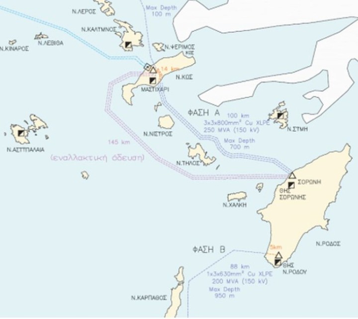 - Τρία Υ/Β καλώδια Ρόδος (ΑΗΣ Σορωνής) – Κως (Υ/Σ Μαστιχάρι) μήκους 100 χλμ περίπου. - Ένα Υ/Β καλώδιο, μεταξύ Καρπάθου – Ρόδου (ΘΗΣ Ν. Ρόδου) μήκους 88 χλμ περίπου. - Δύο νέοι Υ/Σ GIS 150, ένας στην Κάρπαθο και ένας στην Κω (Μαστιχάρι).