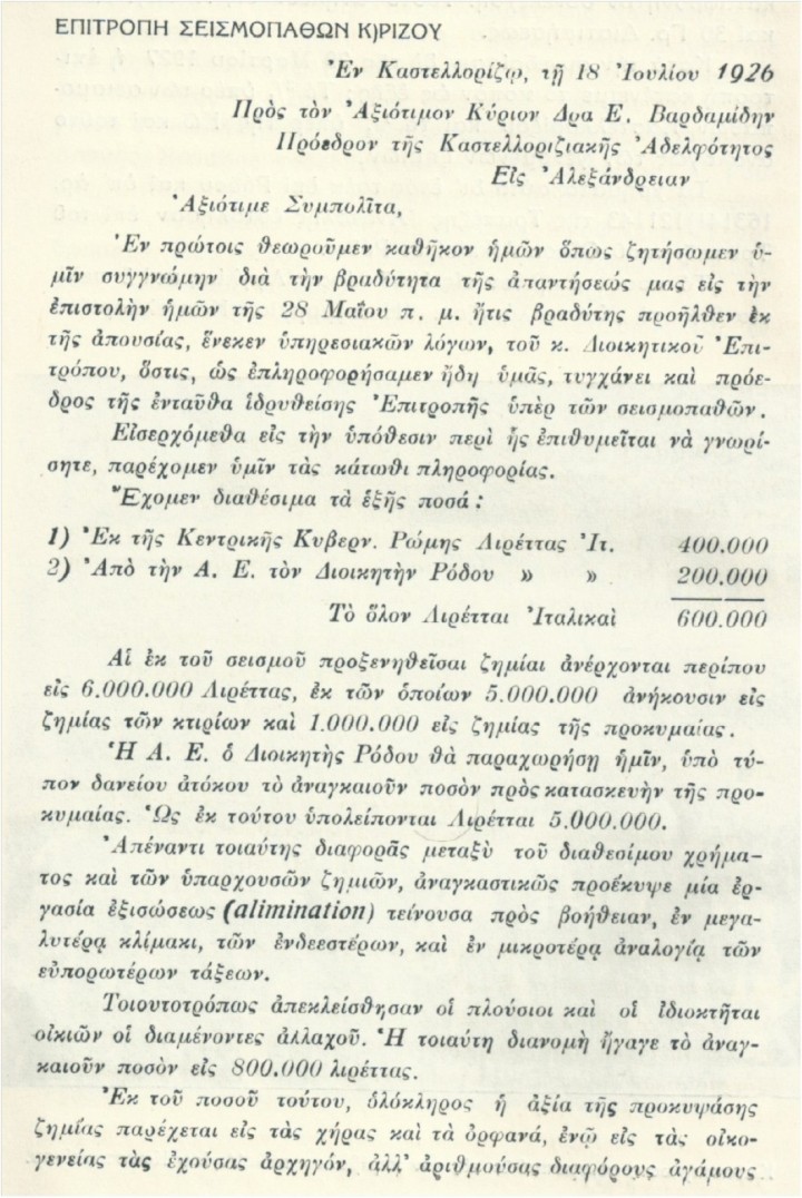 Κατά τη συνεδρίαση δε της 29 Μαρτίου 1927, η επιτροπή κατένειμε το ποσό που συγκεντρώθηκε ως εξής: ¾ υπέρ των σεισμοπαθών Καστελλορίζου και ¼ υπέρ της Κω κατά αναλογία με τις ζημιές που έγιναν. Τα χρήματα αυτά δια ενός τσεκ επί Ρόδου και υπ. Αρ. 163141/121143 της Τράπεζας Ανατολής εστάλησαν επί του Τραπεζικού Οίκου Alcatef στη Ρόδο. Το ποσό ανήλθε στις 1067 Λίρες Αγγλίας και 3 σελίνια για το Καστελλόριζο.