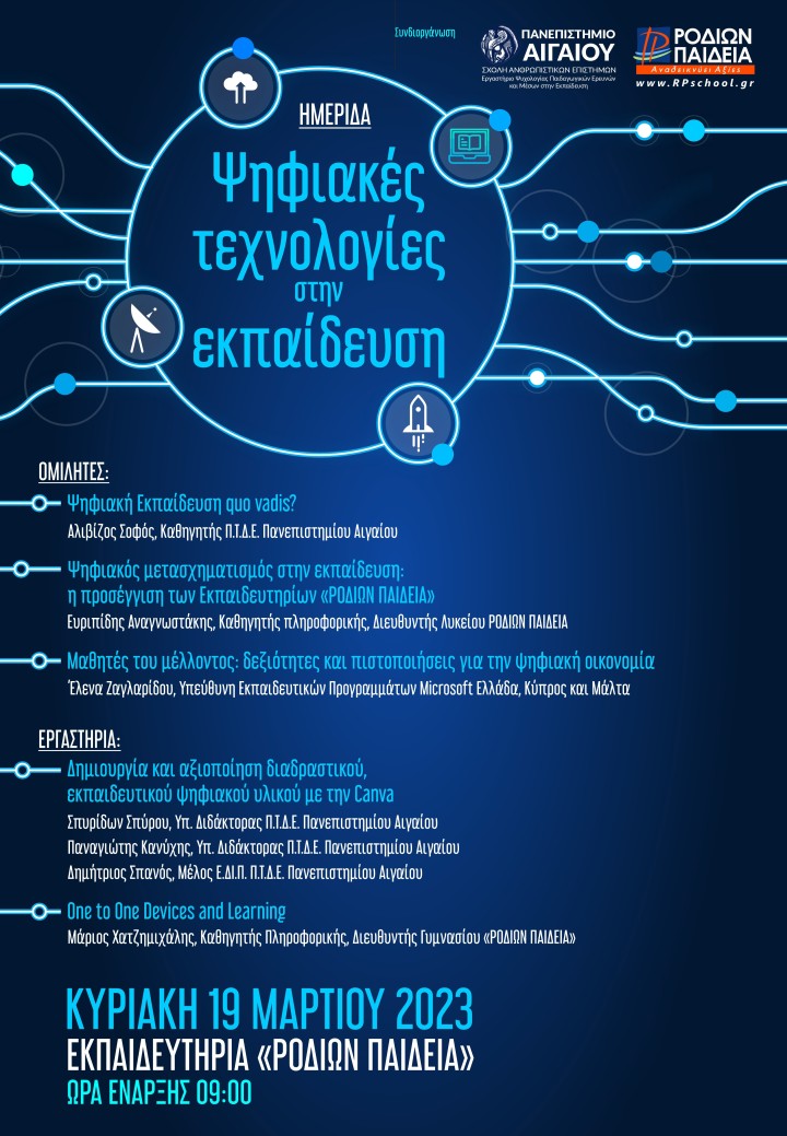 Το Εργαστήριο Ψυχολογίας Παιδαγωγικών Ερευνών και Μέσων στην Εκπαίδευση του Παιδαγωγικού Τμήματος Δημοτικής Εκπαίδευσης Πανεπιστήμιο Αιγαίου και τα Εκπαιδευτήρια «ΡΟΔΙΩΝ ΠΑΙΔΕΙΑ» σας προσκαλούν να παρακολουθήσετε την Ημερίδα με θέμα: «Ψηφιακές Τεχνολογίες στην Εκπαίδευση».