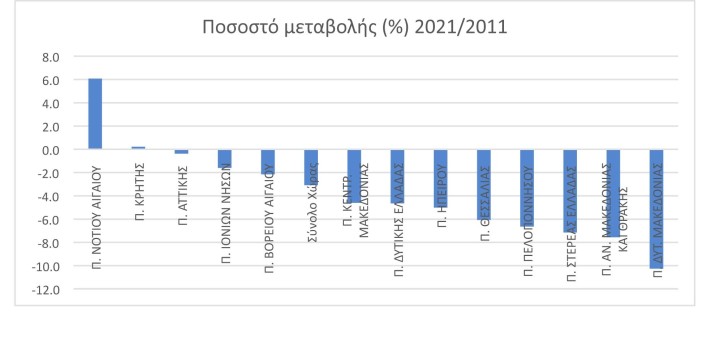 Μοναδική σε αύξηση πληθυσμού ήταν η περιφέρεια Νοτίου Αιγαίου σύμφωνα με τα αποτελέσματα απογραφής μόνιμου πληθυσμού του 2021 που δημοσιεύτηκαν την περασμένη εβδομάδα από την ΕΛΣΤΑΤ. Πανελλαδικά ο μόνιμος πληθυσμός μειώθηκε κατά 3,1% ενώ σε όλες τις περιφέρειες της Ελλάδας ο πληθυσμός παρουσίασε μείωση πλην της περιφέρειας Νοτίου Αιγαίου, όπου αυξήθηκε κατά 6,1%, και της Κρήτης, όπου παρέμεινε σταθερός.