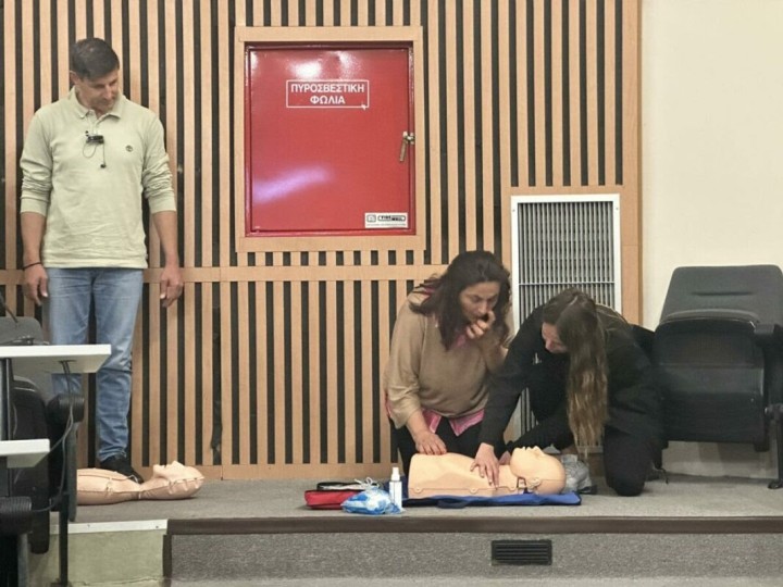 Στη συνέχεια, ακολούθησε η εξάσκησή τους πάνω στην Καρδιοπνευμονική Αναζωογόνηση, στη χρήση του Αυτόματου Εξωτερικού Απινιδωτή, στην Πλάγια θέση Ασφαλείας και στην Αφαίρεση ενός Ξένου Σώματος (Πνιγμονή) – Τεχνική Heimlich.