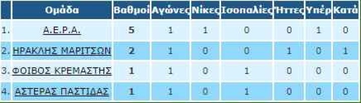 Παστίδα (5μ.μ.): Αστέρας Παστίδας – ΑΕΡΑ (Στεργάκης) Δουλγέρης, Στεφανάκης, Σαρρής (Κατσιδώνης).