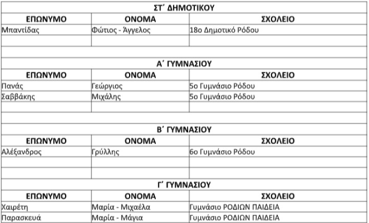 Τα ονόματα των μαθητών ανά τάξη και κατ’ αλφαβητική σειρά, καθώς και το σχολείο φοίτησής τους παρουσιάζονται στον πίνακα που ακολουθεί: